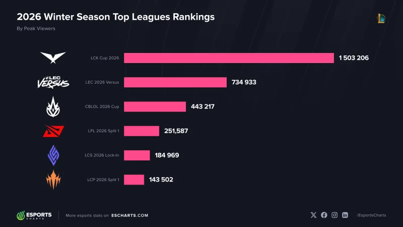 此前国外数据统计网站Esports Charts发布了各个赛区第一赛段的收视数据(不包括中国大陆直播平台数据)。而LCP太平洋联赛是唯一一个相比去年各项数据均下跌的联赛。而对于收视下跌有观点认为和开赛时间有关,下午2点的开赛时间对于上班族和学生党并不友好,即便是周末很多人在这个时间也有其他安排而不会选择看比赛。