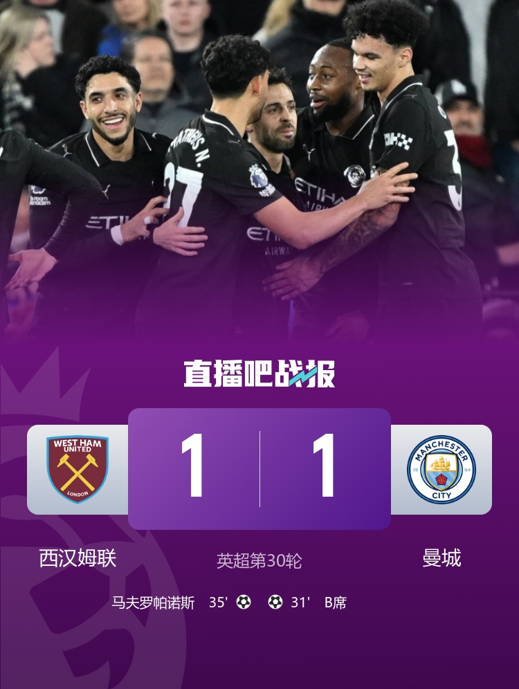 曼城1-1战平西汉姆联,各项赛事近4战只收获1胜,联赛落后榜首9分。