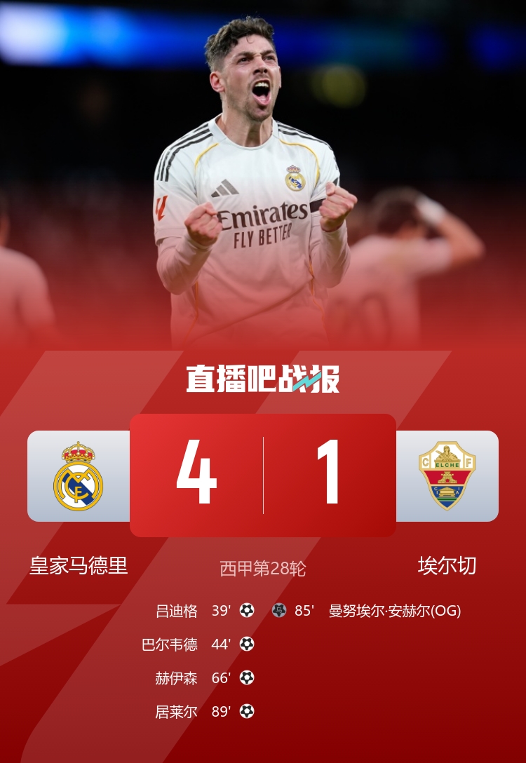 居莱尔惊天吊射!皇马4-1埃尔切暂距榜首1分 巴尔韦德连续3场破门