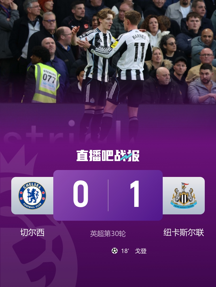 两连败!切尔西0-1纽卡先赛净胜球优势排第五 戈登破门+中柱