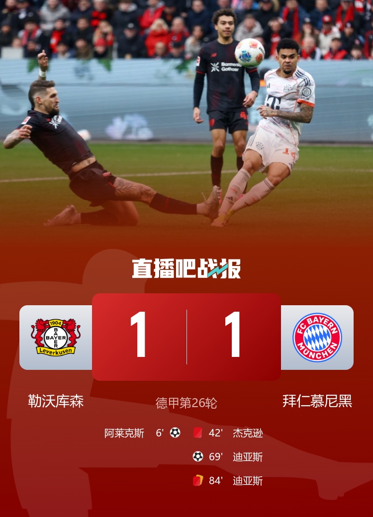 拜仁1-1勒沃库森,各项赛事七连胜终结,9分优势领跑积分榜。本场拜仁杰克逊、迪亚斯染红。