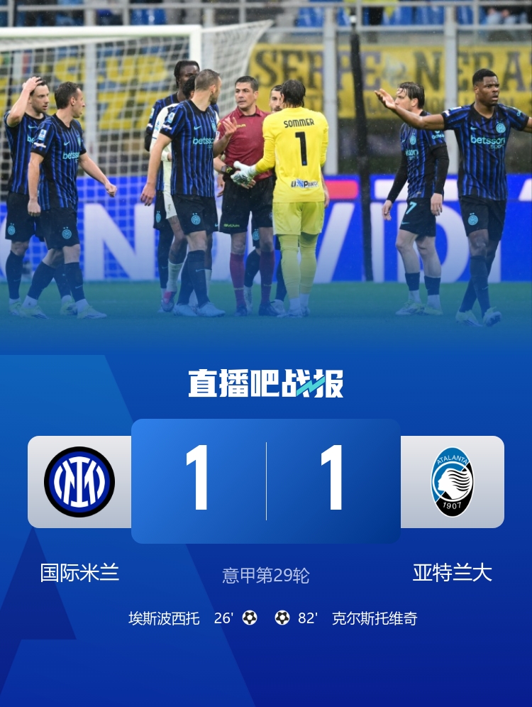 国米1-1战平亚特兰大,意甲2轮不胜,近5场各项赛事仅1胜,先赛仍8分领跑意甲。