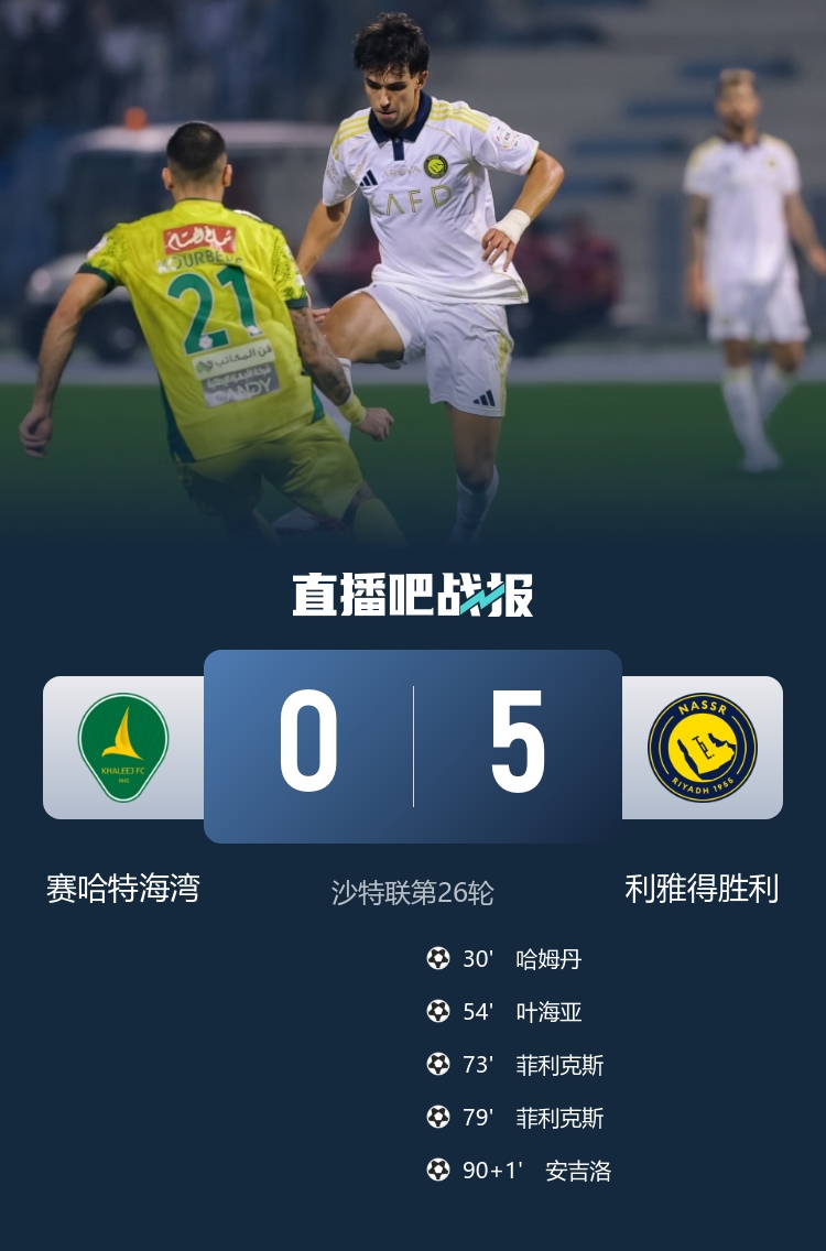 利雅得胜利5-0大胜赛哈特海湾,豪取沙特联12连胜。