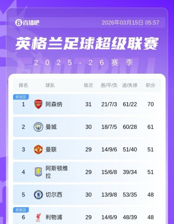 本轮过后,阿森纳多赛1场9分领跑,在曼城战平后,枪手的优势扩大了。